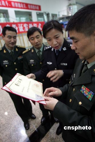 二月二十三日,北京海淀警方人口處警員來到中國航天員科研訓(xùn)練中心,為航天英雄、中國航天員科研訓(xùn)練中心副主任楊利偉、神七航天英雄翟志剛、英雄航天員劉伯明、景海鵬及其他航天員代表頒發(fā)居民身份證。中新社發(fā) 韓峻巍 攝