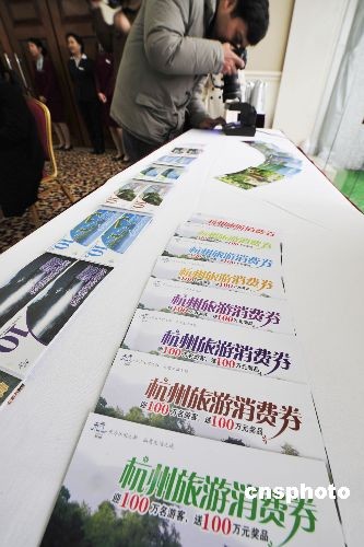 2月26日,杭州市宣布“杭州旅游消費(fèi)券”發(fā)放及使用說明,并開始正式面向以長三角地區(qū)為重點(diǎn)的國內(nèi)及港澳臺旅游市場免費(fèi)發(fā)放240萬份總面值為1.5億元的“杭州旅游消費(fèi)券”,從2009年3月1日起至5月31日止,持券游客來杭旅游可在指定商家使用并享受相應(yīng)的優(yōu)惠。 中新社發(fā) 李忠 攝
