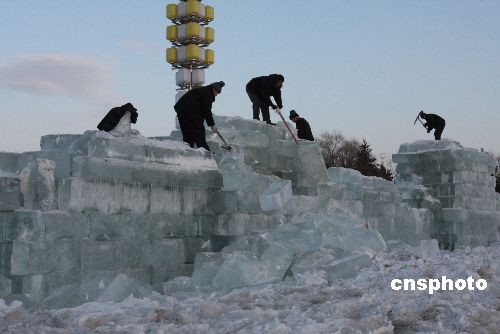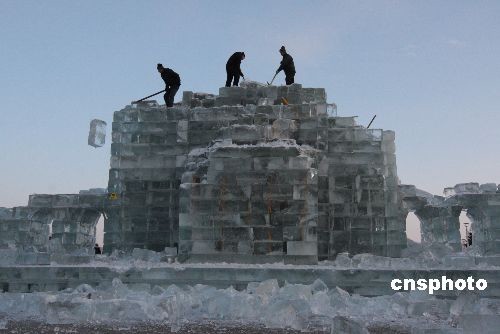2月28日,施工人員在牡丹江市城區(qū)冰堡旅游景點拆除融化的冰雕作品。“立春”過后,素有“雪城”之稱的黑龍江省牡丹江市氣溫回升較快,城區(qū)內的各大冰雪旅游景點的冰雪作品開始融化,失去寒冬里的風采。從當日起,城區(qū)冰雪旅游景點管理部門對融化的冰雕作品進行拆除。中新社發(fā) 莊文斌 攝