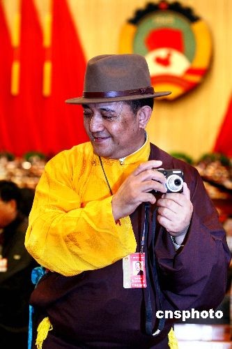 全國政協十一屆二次會議3月3日下午在人民大會堂開幕,一名少數民族委員拿著相機在大會上捕捉精彩瞬間。中新社發(fā) 宋吉河 攝