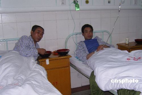 3月6日,河北武安金銘煤礦發(fā)生爆炸事故,14名當班工人被困井下。經(jīng)救援人員全力搜救,目前已有10名被困人員獲救升井,另有2人遇難2人失蹤。圖為在當?shù)蒯t(yī)院入院觀察的礦難幸存者徐從軒(左)和他的工友。中新社發(fā) 牛琳 攝