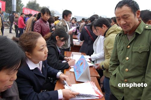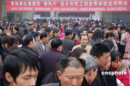為解決農(nóng)民工就業(yè)難的問題,3月9日,四川岳池舉辦“紅盾惠民春風(fēng)行”返鄉(xiāng)農(nóng)民工創(chuàng)業(yè)帶動(dòng)就業(yè)招聘會(huì),上萬名農(nóng)民工前往應(yīng)聘。共有41個(gè)單位參與招聘,提供就業(yè)崗位3400余個(gè)。中新社發(fā) 胡佐斌 攝