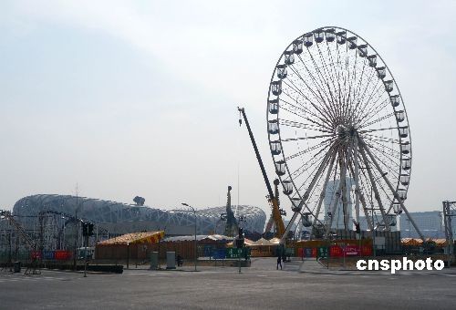 2009年3月10日,在北京奧林匹克公園“鳥巢”東北角,摩天輪、海盜船、太陽神車等在內(nèi)的娛樂設(shè)施已經(jīng)搭建完畢,目前正在加緊調(diào)試中,預(yù)計將于本月中旬開業(yè)迎客。據(jù)悉,此次嘉年華不同于前幾年舉辦的環(huán)球嘉年華活動,包括包括海盜船等在內(nèi)的40個機(jī)動游樂項(xiàng)目和56個競技游樂項(xiàng)目會給游客耳目一新的感覺,而且隨著季節(jié)的更替和游客喜愛程度的不同,這些大型游樂設(shè)施會定期替換。中新社發(fā) 玉龍 攝