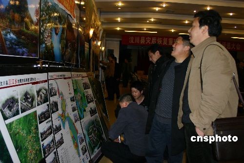 3月11日,為提高災(zāi)后恢復(fù)重建規(guī)劃編制、建設(shè)項目單項設(shè)計的科學(xué)性和嚴(yán)謹(jǐn)性,充分發(fā)揮廣大城鄉(xiāng)規(guī)劃及建筑設(shè)計工作者的積極性和創(chuàng)造性,四川地震重災(zāi)區(qū)汶川縣舉行“汶川縣災(zāi)后恢復(fù)重建規(guī)劃設(shè)計優(yōu)秀成果評選活動”。全縣13個鄉(xiāng)鎮(zhèn)的恢復(fù)重建城市設(shè)計方案紛紛亮相,參與評比,征求專家及群眾意見。圖為公眾參觀設(shè)計方案。中新社發(fā) 霍潺 攝