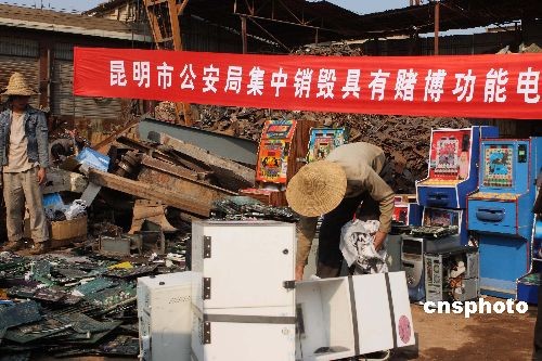 三月十三日,昆明市公安局集中銷毀賭博性游戲機及電路板共1560件,價值上百萬元人民幣。這種賭博游戲機通過無線收發(fā)器來控制內部的電腦,達到操縱賭博結果的目的。圖為被銷毀的賭博游戲機。中新社發(fā) 劉冉陽 攝