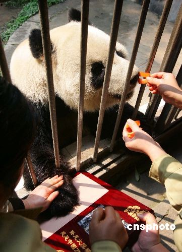 三月十三日上午,福州熊貓世界中心四只來自地震災(zāi)區(qū)的大熊貓,在特制模盤里各自踩下一個(gè)彌足珍貴的“掌印”。這四個(gè)“掌印”將作為大熊貓萬里行感恩活動(dòng)的見證,送往四川臥龍大熊貓研究中心,作為永久留念保存。中新社發(fā) 楊婀娜 攝