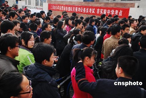 3月15日,參加山東公務(wù)員考試的考生們在山東東營市實驗中學考點等待進入考場。當日,2009年度山東公務(wù)員考試公共科目筆試在全省同時舉行,共有39萬多人參加考試,競爭8685個崗位。中新社發(fā) 李波 攝