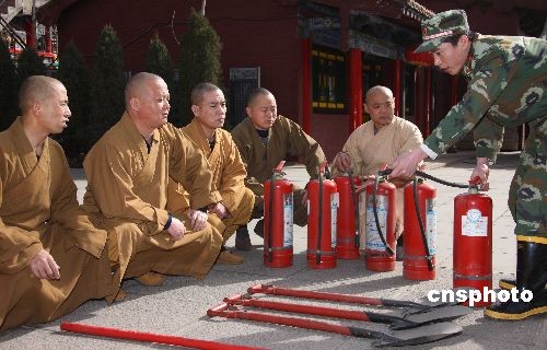 2009年3月17日,山西省盂縣永清寺院內(nèi),消防戰(zhàn)士在向僧人講解滅火器的正確使用方法。當日,盂縣消防大隊開展“消防安全進寺廟”活動,消防戰(zhàn)士深入寺廟,手把手教僧人使用消防器材,現(xiàn)場培訓僧人在火災發(fā)生后第一時間內(nèi)協(xié)助消防員進行救援、緊急疏散的技能。中新社發(fā) 程瑜 攝