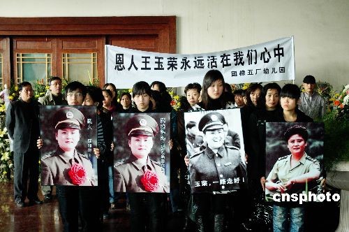 3月18日,王玉榮同志的追悼會(huì)在鄭州殯儀館舉行,公安部,河南省市領(lǐng)導(dǎo)及省會(huì)各界群眾參加了追悼會(huì)。王玉榮3月14日因病在鄭州去世,終年48歲。 王玉榮生前曾迎著歹徒的炸藥包,成功解救28名幼兒和兩名教師,先后參與20多起大要案?jìng)善,獲得過全國(guó)公安系統(tǒng)一級(jí)英模、全國(guó)“三八紅旗手”、全國(guó)杰出青年衛(wèi)士、中國(guó)十大女杰等殊榮。中新社發(fā) 賈建偉 攝