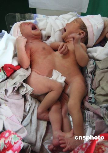 3月18日,躺在湖南省新化縣中醫(yī)院婦產(chǎn)科內(nèi)的連體嬰兒。16日,湖南省婁底市新化縣石沖口鎮(zhèn)紅寨村28歲的段曉艷在新化縣中醫(yī)院剖腹產(chǎn)下該市首例連體嬰兒。連體嬰兒都是女嬰,體重4.8公斤。面對這對連體女嬰,段曉艷一家人憂心忡忡,不知后期手術(shù)費(fèi)用如何籌措。目前,連體嬰兒已得到了首筆1000元的捐款。18日,湖南省兒童醫(yī)院的醫(yī)生將連體嬰兒接去長沙市治療。 中新社發(fā) 郭國權(quán) 攝