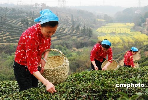 3月19日,廬山云霧茶各生產(chǎn)基地開始采摘新茶。這也意味著品質(zhì)最好的廬山云霧茶新茶“明前茶”將開始進(jìn)入市場(chǎng)。廬山云霧茶因日照霧薰,其味清香異常,經(jīng)久不散,是中國有名的特種茶,以“味醇、色秀、香馨、液清”而久負(fù)盛名,連續(xù)兩屆獲中國國際茶業(yè)博覽會(huì)金獎(jiǎng)。中新社發(fā) 胡國林 攝