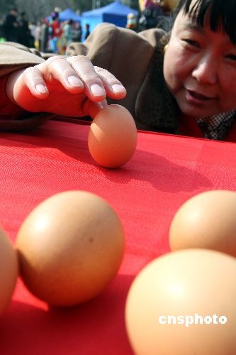 三月二十日,是中國(guó)二十四節(jié)氣中的春分。北京春分朝陽民俗文化藝術(shù)節(jié)閃亮登場(chǎng),民眾紛紛“豎”雞蛋迎春分!按悍值,蛋兒俏”,中國(guó)春分時(shí)節(jié)的“豎蛋游戲”,目前已成為世界性的游戲。中新社發(fā) 任海霞 攝