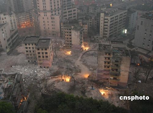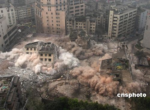 2009年3月21日,重慶江北區(qū)觀音橋處成功進(jìn)行了危舊房定向爆破。當(dāng)日早晨8時,一聲巨響,當(dāng)?shù)赜灞倍宥柕貕K的6棟樓房被爆破拆除,總面積1000平方米。這是重慶2009年危舊房改造的第一爆,是觀音橋商圈快速推進(jìn)“長江上游商貿(mào)中心”的重要舉措。中新社發(fā) 賀終榮 攝