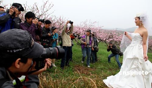 3月21日,攝影師們正在以婚紗美女為模特進(jìn)行拍攝。由宜昌市攝影家協(xié)會(huì)、三峽廣電新聞網(wǎng)及“真愛(ài)”婚紗攝影共同舉辦“三峽春天攝影大賽”日前在枝江萬(wàn)畝桃花園開(kāi)賽,百余名專(zhuān)業(yè)攝影師及攝影愛(ài)好者以攝影會(huì)友。 中新社發(fā) 望作信 攝
