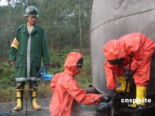 3月23日清晨,廣西南北高速公路那麗出口處,一輛運載蔬菜的貨車與一輛裝載瀝青的槽車追尾,造成貨車上3人被困,槽車上大量瀝青泄漏,流向當地一飲用水源江河。經過欽州消防人員3個小時的艱辛奮戰(zhàn),瀝青終于被成功堵截,未流入河中。中新社發(fā) 田華松 攝