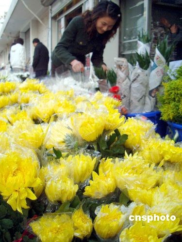 3月24日,顧客在蘇州市養(yǎng)育巷一家花店選購(gòu)祭祀菊花。隨著清明節(jié)的臨近,蘇州鮮花市場(chǎng)上菊花、百合等花卉熱銷,不少蘇州市民選擇用鮮花替代元寶蠟燭祭奠親人,樹立文明祭拜新風(fēng)。中新社發(fā) 王建康 攝