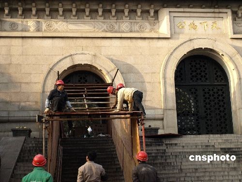 據(jù)南京市中山陵園管理局消息,為迎接孫中山奉安大典80周年,南京市近日投資300多萬元啟動(dòng)中山陵主體建筑維修工程。據(jù)了解,這也是自新中國(guó)成立近60年來,中山陵第二次大規(guī)模維修,上次規(guī)模較大的維修是在1982年!拔崴乐,可葬于紫金山麓,因南京為臨時(shí)政府所在地,所以不忘辛亥革命也!弊裾諏O中山先生的遺愿,中山陵于1926年春開始修建,至1929年建成,當(dāng)年6月1日,中山先生的靈柩奉安于此。 中新社發(fā) 楊潔 攝