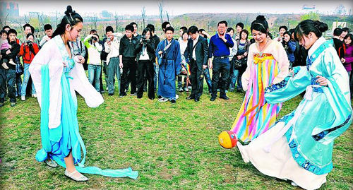 3月29日,農(nóng)歷三月三上巳節(jié),是中國(guó)傳統(tǒng)的“女兒節(jié)”。西安一群愛(ài)好漢服的女子來(lái)到唐城墻遺址公園的吟詩(shī)壇里秀風(fēng)采。幾個(gè)女孩子以古代名畫(huà)《女史箴圖》為藍(lán)本,以情景劇形式表現(xiàn)中國(guó)古代貴婦的妝容文化。旁邊還配有專(zhuān)業(yè)人士指導(dǎo)并現(xiàn)場(chǎng)解說(shuō),向大家介紹中國(guó)古代婦女的妝容。隨后,她們又到曲江池遺址公園湖邊,舉行祓禊祈福活動(dòng),并踢起了球。