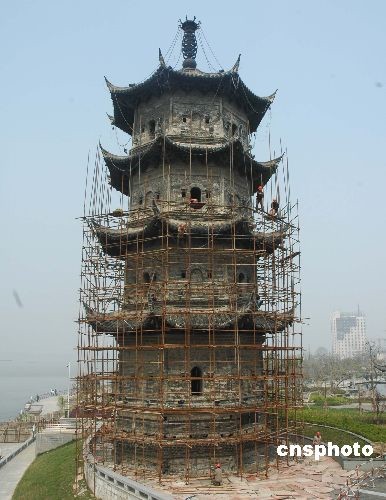 3月31日,施工人員在搭建腳手架準(zhǔn)備修繕中江塔。聳立在安徽蕪湖長江之畔的中江塔,始建于明朝,清初續(xù)建落成,耗時60年。塔高43.7米,為古代長江之中江地域位置的標(biāo)志性建筑,也是船只進(jìn)入蕪湖的航標(biāo)。由于長期日曬雨淋,塔體風(fēng)化比較嚴(yán)重,當(dāng)?shù)卣I措資金,近日對中江塔實施搶修保護(hù)。中新社發(fā) 陳立希 攝