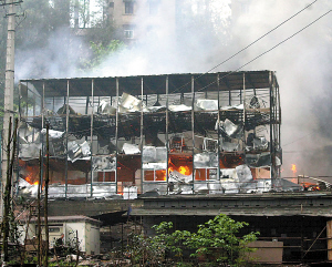 大約8點(diǎn)30分,活動(dòng)板房底樓最邊上的一個(gè)房間最先冒出濃煙,接著躥起明火。江北區(qū)消防支隊(duì)石馬河中隊(duì)在10分鐘內(nèi)趕到現(xiàn)場(chǎng),最先起火的1號(hào)樓已被大火吞沒,3號(hào)樓也開始燃燒。20分鐘內(nèi),兩棟活動(dòng)板房就已完全過火。