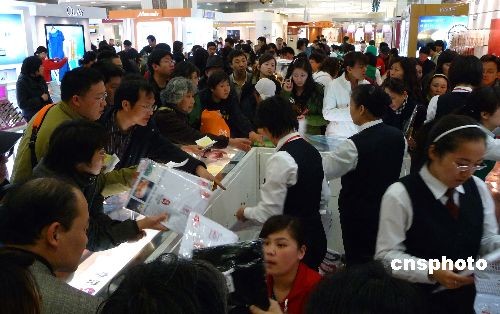 2009年3月31日,北京王府井奧運(yùn)特許商品店,顧客竟相搶購各類奧運(yùn)紀(jì)念品。當(dāng)日,手提大包小裹奧運(yùn)紀(jì)念品的人們成為金街一道靚麗風(fēng)景。按照相關(guān)規(guī)定,奧運(yùn)特許商品銷售日期截止到31日24時(shí)。北京一些大型商場(chǎng)內(nèi)的奧運(yùn)特許商品銷售點(diǎn)紛紛以超低價(jià)格進(jìn)行拋售。中新社發(fā) 玉龍 攝