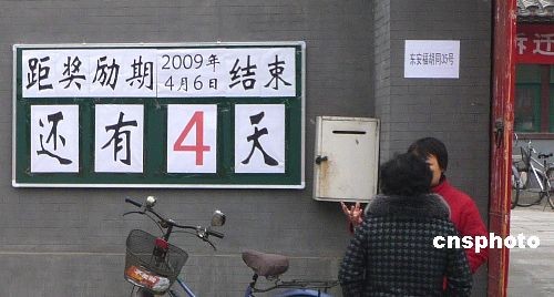 2009年4月2日,北京西長(zhǎng)安街拆遷辦旁設(shè)立的獎(jiǎng)勵(lì)期已進(jìn)入倒計(jì)時(shí)第4天。近日,為鼓勵(lì)拆遷戶提前搬走,拆遷辦設(shè)立了獎(jiǎng)勵(lì)期。據(jù)悉,4月6日前簽訂協(xié)議的,每戶給予提前搬家獎(jiǎng)勵(lì)2.5萬元,重點(diǎn)工程配合獎(jiǎng)勵(lì)5萬元,合計(jì)7.5萬元?紤]到居民周轉(zhuǎn)的困難,還將對(duì)此部分居民給予一次性周轉(zhuǎn)補(bǔ)貼1000元/平方米。4月6日后,未簽訂協(xié)議的被視為放棄獎(jiǎng)勵(lì)。 截至目前,拆遷范圍內(nèi)的36家單位已全部與拆遷辦簽訂拆遷協(xié)議,大部分單位已開始騰退房屋。而拆遷區(qū)內(nèi)大部分住戶也簽訂了拆遷協(xié)議,部分住戶已購(gòu)置了兩限房,搬進(jìn)了新家。 中新社發(fā) 玉龍 攝