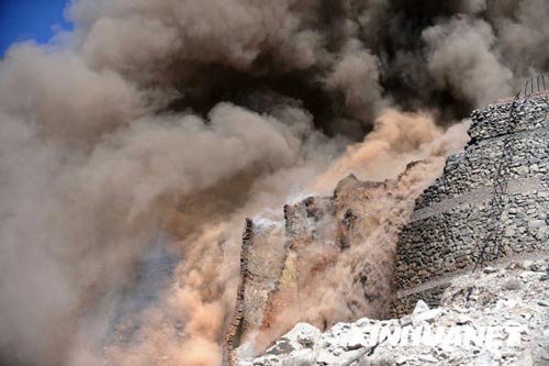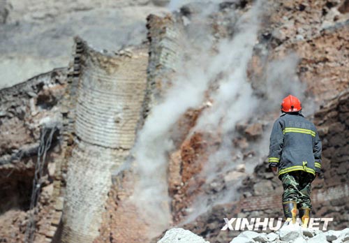 目前,救援工作仍在進行中。由于石灰窯窯口前的臺地面積很小,且有一條大裂縫,消防車一時難以駛?cè)耄幌廊藛T用高壓水槍作業(yè)時,水一噴上去窯體即不斷塌方,救援難度較大。