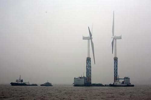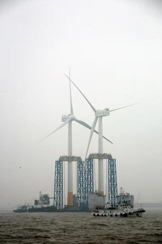 人民網(wǎng)上海4月5日電 昨晚,國(guó)家海上風(fēng)電示范項(xiàng)目、上海市重大工程——東海大橋100兆瓦海上風(fēng)電場(chǎng)的第二、第三臺(tái)風(fēng)機(jī),在上海洋山港海事處的護(hù)航和監(jiān)控下,經(jīng)過38海里的海上航行,被一次性運(yùn)抵吊裝作業(yè)地點(diǎn)。