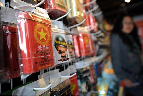2009年4月11日,浙江嘉興西塘古鎮(zhèn)上,一家店鋪出售的香煙盒很雷人,香煙盒外身印著“流氓合格證”,也有印著“處男證”的。