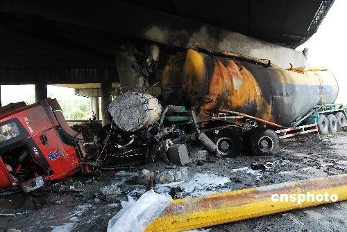 4月17日凌晨,在湖南郴州市郴資桂高等級公路與京珠高速公路交叉處,一輛水泥槽罐車由東往西方向行駛,因貨車司機(jī)疲勞駕駛撞上京珠高速主線由南往北橫跨郴資桂大橋(K490+200北上)的橋墩上,造成貨車起火,兩根立柱斷裂,一根立柱受損,該大橋橫梁塌落,往北方向的橋面塌陷,京珠高速公路耒宜段郴州至良田被迫中斷交通。肇事車輛上1人死亡,1人受傷,1人逃逸。事故發(fā)生后,湖南省郴州市、省交通廳、省高速公路管理局領(lǐng)導(dǎo)立即趕赴現(xiàn)場,指導(dǎo)現(xiàn)場處置、交通救援和事故處理,做好保安全、保暢通、保穩(wěn)定工作。上午10時南行線通車,下午14時,單幅雙向間斷恢復(fù)通車。目前,省市有關(guān)部門正在緊急進(jìn)行橋梁的加固搶修,防止橋面整體坍塌。事故原因進(jìn)一步調(diào)查和善后處理正在有序進(jìn)行之中。中新社發(fā) 賀茂峰 攝