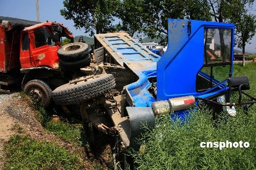 2009年4月17日11時(shí)許,在安徽休寧慈張線川湖路段發(fā)生一起嚴(yán)重車禍。一輛裝滿石子的大貨車在左拐彎時(shí)與迎面而來的一輛貨車發(fā)生了嚴(yán)重相撞,裝滿石子的大貨車被撞入2多米深的油菜田,兩車身嚴(yán)重受損,駕駛室被撞得不堪入目,兩名駕駛員受傷嚴(yán)重,被送往就近醫(yī)院搶救。據(jù)當(dāng)?shù)亟痪Q,兩車速度過快,應(yīng)處不當(dāng),是導(dǎo)致這起事故的主要原因。中新社發(fā) 方也廣德 攝