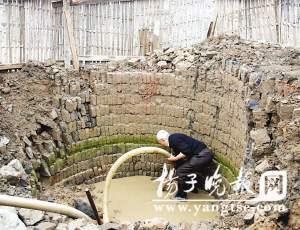 據(jù)悉,古井位置位于六合區(qū)瓜埠地質(zhì)公園西邊1000米的一個(gè)放生池挖掘工地中央。目前數(shù)十臺(tái)施工機(jī)械已停止施工。知情者告訴記者,這里原來是高近百米、占地50多畝的荒山頭。今年初,當(dāng)?shù)卣鶕?jù)規(guī)劃,打算將這個(gè)荒山開發(fā)成一個(gè)放生魚池,目前,山頭被削平后,已往下挖掘了50多米,這口古井正是挖掘機(jī)司機(jī)在作業(yè)時(shí)無意間發(fā)現(xiàn)的。