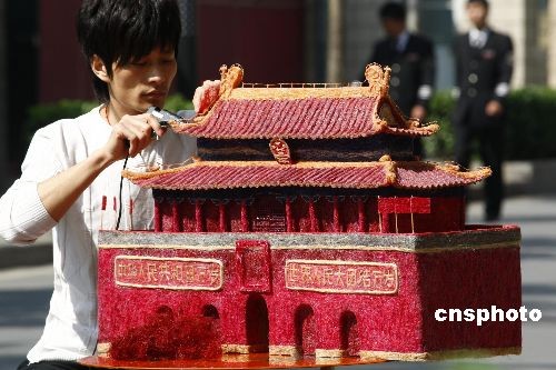 為迎接60周年大慶,北京一位發(fā)型設(shè)計(jì)師用碎頭發(fā)制作了一個(gè)微型“天安門”,總共用了11公斤長(zhǎng)短不一的碎頭發(fā),歷時(shí)5個(gè)多月才完工。這位來自四川的青年理發(fā)師,此前還為奧運(yùn)獻(xiàn)上了頭發(fā)絲作的“鳥巢”、“水立方”、“福娃”等,并贏得了國(guó)內(nèi)外游客的好評(píng)。中新社發(fā) 鄭雄增 攝