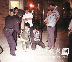 記者趕到現(xiàn)場時,兩名年輕男子雙手被反綁,跪在小區(qū)門口不敢動彈,他們的臉上有多處傷痕。兩名男子四周站滿了小區(qū)業(yè)主,面對大家的指責(zé),他們低下了頭,不斷求饒,讓大家放他們一馬。據(jù)一名小區(qū)保安介紹,當(dāng)晚,他和另外一名保安在門衛(wèi)室值勤。到了9點半時,他發(fā)現(xiàn)兩名陌生男子推著一輛自行車從小區(qū)內(nèi)走來,兩人還邊走邊四處張望。他覺得對方可疑,當(dāng)即喊上一名同事上去盤問。經(jīng)盤問,兩名男子并不是小區(qū)業(yè)主,也無法說出來小區(qū)的目的,對于自行車的來歷,更是支支吾吾。細(xì)心的保安發(fā)現(xiàn)自行車鎖有明顯被撬痕跡,當(dāng)即斷定兩人是偷車賊,于是,當(dāng)場將這兩人按倒,同時呼叫其他保安增援。小區(qū)業(yè)主孫先生說,兩名偷車男子被揪住后不一會兒,就哭著求饒了,并主動承認(rèn)他們是來小區(qū)偷自行車的,也表示將自行車歸還,希望保安放他們一馬。兩保安見那兩男子服軟了,才停手,但他們沒有立即報警,而是找來繩子將兩名男子雙手反綁在背后,然后脫去他們的鞋子,逼迫他們跪在門衛(wèi)室門口。