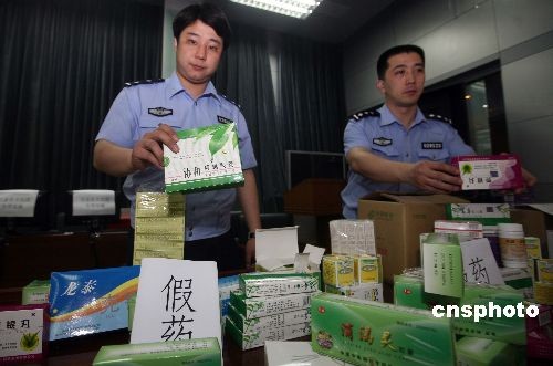 5月7日,北京宣武警方宣布:歷時(shí)兩個(gè)多月艱苦縝密的偵查,成功破獲了“2.19”特大制售假藥團(tuán)伙案,抓獲涉案人員140余名(其中刑事拘留處理131人),打掉分布于宣武、豐臺(tái)、通州3區(qū)的10個(gè)生產(chǎn)銷售假藥窩點(diǎn),截至目前已清查收繳120余種、重達(dá)10余噸的假藥和大量制假設(shè)備,收繳作案用車10輛。中新社發(fā) 湯亮 攝