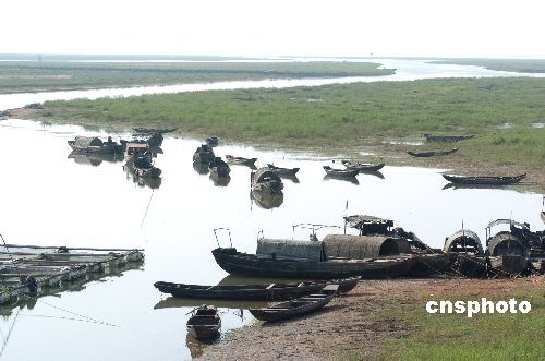5月7日,進(jìn)入汛期的鄱陽湖進(jìn)賢縣三里鄉(xiāng)水域現(xiàn)出罕見低水位。雖然進(jìn)入了汛期,但中國第一大淡水湖鄱陽湖仍然沒“喝飽”水。由于08年以來的干旱導(dǎo)致周邊水庫和河流存水大幅度減少,河流水庫“底氣”不足,09年前4個月鄱陽湖的入湖水量減少了一半以上,加之1月至5月上旬,降水量偏少,導(dǎo)致鄱陽湖部分區(qū)域出現(xiàn)低水位現(xiàn)象。中新社發(fā) 朱文標(biāo) 攝