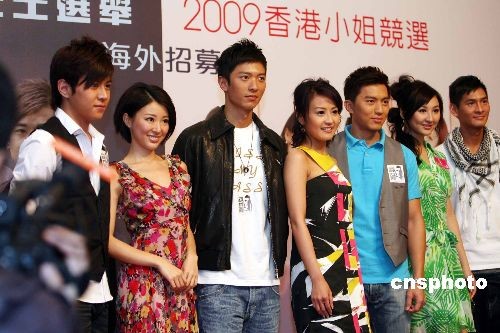 香港無(wú)線電視舉辦一年一度的香港小姐選舉及香港先生選舉即將召開,十六日,香港無(wú)線電視舉行記者會(huì),公布海外招募行動(dòng)全面展開。港男高鈞賢、港姐亞軍陳倩揚(yáng)等一眾香港先生及應(yīng)屆香港小姐出席活動(dòng)造勢(shì)宣傳。中新社發(fā) 洪少葵 攝