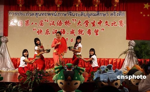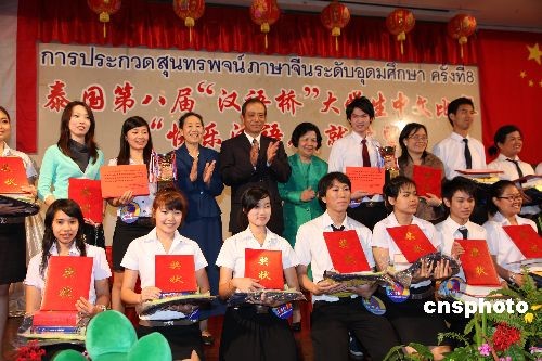 6月6日,由中國駐泰國大使館和泰國教育部高等教育委員會(huì)聯(lián)合舉辦的泰國第八屆“漢語橋”大學(xué)生中文比賽在曼谷城市酒店舉行。選拔自泰國朱拉隆功大學(xué)、法政大學(xué)、皇太后大學(xué)等19所精英大學(xué)的19名選手用地道的漢語闡述了“快樂漢語,成就希望”的大賽主題,表達(dá)了泰國大學(xué)生對中國的期盼與祝福。經(jīng)過4個(gè)多小時(shí)緊張激烈的比賽,由中泰雙方漢語專家組成的大賽評(píng)委會(huì)評(píng)出了一等獎(jiǎng)2名、二等獎(jiǎng)4名、三等獎(jiǎng)6名、積極參與獎(jiǎng)7名、優(yōu)秀組織獎(jiǎng)2所大學(xué)。當(dāng)日獲得一等獎(jiǎng)的來自博仁大學(xué)的董詩碧和易三倉大學(xué)的江振茂兩位同學(xué),將代表泰國到中國參加全球決賽,其他選手也獲得了到中國進(jìn)參加秋令營的獎(jiǎng)學(xué)金。中新社發(fā) 顧時(shí)宏 攝