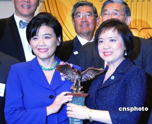 七月二十三日晚,國際領(lǐng)袖基金會在華盛頓舉行頒獎晚會,獎勵杰出的亞裔人士,在美國國會中僅有的兩名華裔議員吳振偉、趙美心分別獲得“年度杰出公職服務(wù)獎”。圖為美國“國際領(lǐng)袖基金會”執(zhí)行長、曾任美國商務(wù)部少數(shù)族裔發(fā)展署副署長兼幕僚長的華裔政界名媛董繼玲(右),向美國華裔女眾議員趙美心頒獎。國際領(lǐng)袖基金會為全美最著名的亞裔青年領(lǐng)袖訓練機構(gòu),每年定期表揚促進國際經(jīng)貿(mào)繁榮、發(fā)揚中華文化傳承有卓越成就的杰出人士。中新社發(fā) 吳慶才 攝