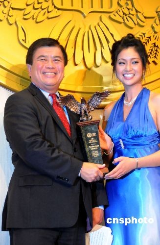 七月二十三日晚,國際領(lǐng)袖基金會在華盛頓舉行頒獎晚會,在美國國會中僅有的兩名華裔議員吳振偉、趙美心分別獲得“年度杰出公職服務(wù)獎”。圖為美國首位華裔眾議員吳振偉領(lǐng)取“年度杰出公職服務(wù)獎”。國際領(lǐng)袖基金會為全美最著名的亞裔青年領(lǐng)袖訓(xùn)練機(jī)構(gòu),每年定期表揚(yáng)促進(jìn)國際經(jīng)貿(mào)繁榮、發(fā)揚(yáng)中華文化傳承有卓越成就的杰出人士。中新社發(fā) 吳慶才 攝