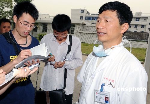 6月1日,福州市肺科醫(yī)院副院長林鐘軒(右)在接受記者采訪時表示:福建省第四例甲型H1N1流感患者經(jīng)過治療目前病情有所好轉。該患者,男,22歲,美國籍,在美國一企業(yè)工作。5月26日從紐約乘機經(jīng)溫哥華至香港,在香港轉乘KA660航班,北京時間28日上午抵達福州長樂國際機場。30日上午因發(fā)熱、咳嗽就診連江縣琯頭衛(wèi)生院,測體溫38.3℃。31日凌晨轉至福州肺科醫(yī)院隔離治療,入院測體溫39.3℃,伴咳嗽、頭痛、咽痛等流感樣癥狀。30日晚上福州市疾病預防控制中心對患者鼻咽拭子標本進行了檢測,結果為甲型H1N1流感病毒核酸陽性。省衛(wèi)生廳專家組根據(jù)患者的臨床表現(xiàn)、流行病學史和實驗室檢測結果,按照衛(wèi)生部制定的診療方案,判定該病例為甲型H1N1流感確診病例。相關情況已經(jīng)報告衛(wèi)生部。中新社發(fā) 劉可耕 攝