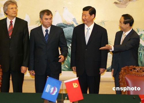 6月2日下午,中聯(lián)部部長(zhǎng)王家瑞(右一)在北京人民大會(huì)堂與俄羅斯“統(tǒng)俄黨”總委會(huì)主席團(tuán)書(shū)記、俄羅斯國(guó)家杜馬副主席維·沃洛金(左二)簽署《中國(guó)共產(chǎn)黨與統(tǒng)一俄羅斯黨合作協(xié)議》、《中國(guó)共產(chǎn)黨與統(tǒng)一俄羅斯黨2009-2011年合作備忘錄》兩項(xiàng)協(xié)議。中共中央政治局常委、國(guó)家副主席習(xí)近平(右二)出席簽字儀式。中新社發(fā) 任晨鳴 攝