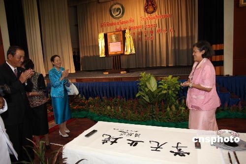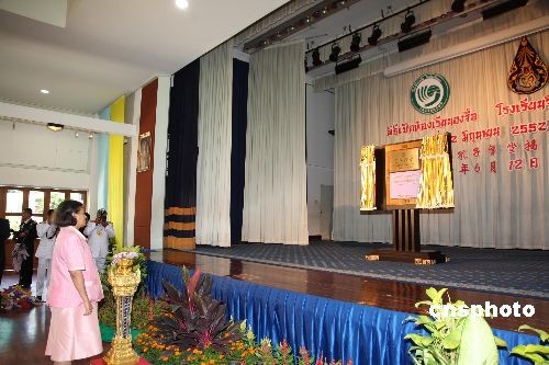 六月十二日的泰國吉拉達(dá)學(xué)校古老校園里洋溢著濃郁的中國文化氣息。在喧天的鑼鼓聲中,泰國瑪哈扎克里·詩琳通公主殿下按動(dòng)電鈕,寫有“吉拉達(dá)學(xué)?鬃诱n堂”的牌匾徐徐拉開帷幕,標(biāo)志著泰國第七家孔子課堂正式落戶這個(gè)坐落于泰國王宮里的學(xué)校。揭牌儀式上,詩琳通公主還興致勃勃地重酌墨水,揮毫為孔子課堂題寫了“學(xué)無止境 ”四個(gè)漢字,并勉勵(lì)泰國各孔子學(xué)院、孔子課堂擔(dān)當(dāng)起推動(dòng)泰國漢語教學(xué)進(jìn)步、促進(jìn)中泰友好關(guān)系發(fā)展的重任。中新社發(fā) 顧時(shí)宏 攝