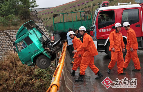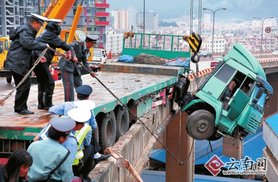 14日上午10時(shí)50分許,昆明市北二環(huán)通往黃土坡方向的小屯立交橋上層立交,上演了驚險(xiǎn)一幕:一輛行駛在立交橋上的大型拖掛車突然撞上立交橋護(hù)欄,沖出立交橋外,車頭“懸掛”在離地面30多米高的護(hù)欄外。事故還造成3人被困駕駛室,經(jīng)過(guò)消防人員施救,3人在這次事故中死里逃生。