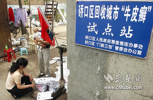 據(jù)硚口區(qū)“門前三包”管委會負責人楊璿介紹,普通廢紙的回收價格為每公斤0.3元,該試點站回收“牛皮癬”的價格則定為每公斤1元,為此,區(qū)有關部門決定給予其免交衛(wèi)生費等項優(yōu)惠。此舉在國內(nèi)尚屬首創(chuàng),計劃在全區(qū)推廣。(王小晗 趙志宏 張梅 周波)