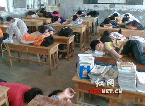 照片顯示,在一個墻皮都有脫落的簡陋教室里,課桌和板凳也比較破舊,看上去條件很差,30多名穿著樸素夏裝的孩子,有的爬在課桌上,有的躺在課桌上頭枕著幾本書睡覺,還有三個男孩子把課桌拼接起來睡上面,有的則干脆睡凳子上,睡姿各異,均是和衣而睡。在沒有睡人的課桌上則堆滿了書籍。