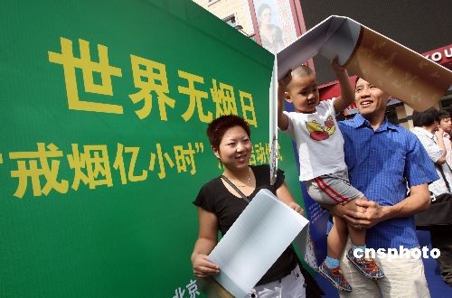 5月29日,一個家庭在北京王府井大街將香煙模型撅斷,這是由北京市愛衛(wèi)會主辦的世界無煙日暨“戒煙億小時”公益活動現(xiàn)場。該活動發(fā)出“戒煙一小時,健康億人行”的戒煙口號,號召“世界無煙日”(5月31日)當(dāng)天17點31分至18點31分之間戒煙一小時。據(jù)悉,中國是世界上煙草生產(chǎn)和消費第一大國,目前約有3.5億吸煙者,并且還在以每年300萬的速度增長,控?zé)熜蝿輼O為嚴(yán)峻。中新社發(fā) 張宇 攝