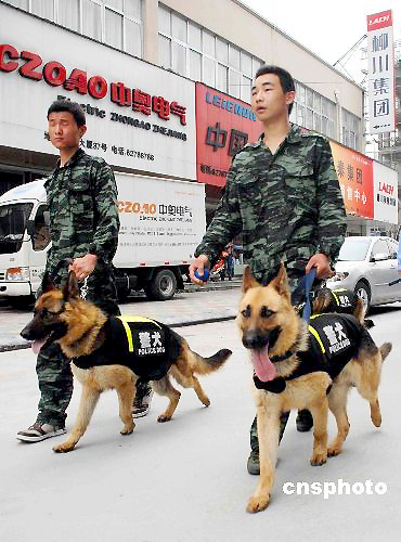 近日,浙江溫州市樂清公安局首次將警犬投入到社會治安管理中。首批4條警犬分為兩組:一組負責樂清柳市車站周邊的巡邏,另一組配合警方設卡和對可疑人員的追蹤、圍堵。2009年4月份,樂清警方專門成立了警犬基地,由保安公司負責飼養(yǎng)與日常管理。目前,警犬基地已從南京軍區(qū)購買20只警犬,每只身價都在萬元以上,多為體型強壯勻稱、勇敢無畏的德國牧羊犬。據(jù)介紹,這20只護衛(wèi)犬主要用于溫州樂清的警戒、巡邏等,其中4只首批受訓成功投入使用。中新社發(fā) 許勛磊 攝