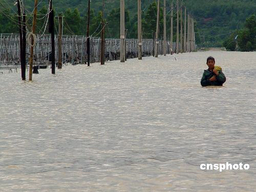 受熱帶風(fēng)暴“蓮花”影響,福建省詔安梅洲鄉(xiāng)下起特大暴雨。據(jù)該縣氣象局測(cè)報(bào), 從6月22日凌晨0點(diǎn)至早上8點(diǎn),8小時(shí)降雨量達(dá)到273毫米。這場(chǎng)暴雨使梅洲鄉(xiāng)遭受罕見(jiàn)水災(zāi),1580多戶民眾家中進(jìn)水,最高進(jìn)水位達(dá)3米多高,上萬(wàn)民眾受災(zāi),近兩千名民眾安全轉(zhuǎn)移。22日中午,雨水停后,水位已開(kāi)始快速回落。中新社發(fā) 沈麗煌 攝