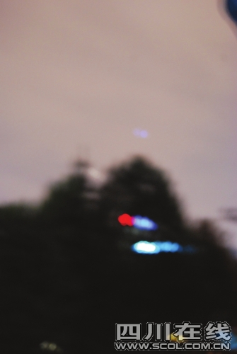 昨(7月2日)晚8點(diǎn)30分左右,成都磨子巷上空出現(xiàn)不明飛行物,附近上千市民從家中跑出,到陽(yáng)臺(tái)或街上觀望:夜幕中有一藍(lán)色光團(tuán)如圓月大小,靜靜觀看時(shí),可發(fā)現(xiàn)該光團(tuán)藍(lán)紅光交替,向西南方向緩慢移動(dòng)(如圖)。該現(xiàn)象持續(xù)至9點(diǎn)50左右結(jié)束,成都市飛碟協(xié)會(huì)秘書(shū)長(zhǎng)楊佛章初步猜測(cè),是涂有發(fā)光材料的風(fēng)箏等物品造成的。